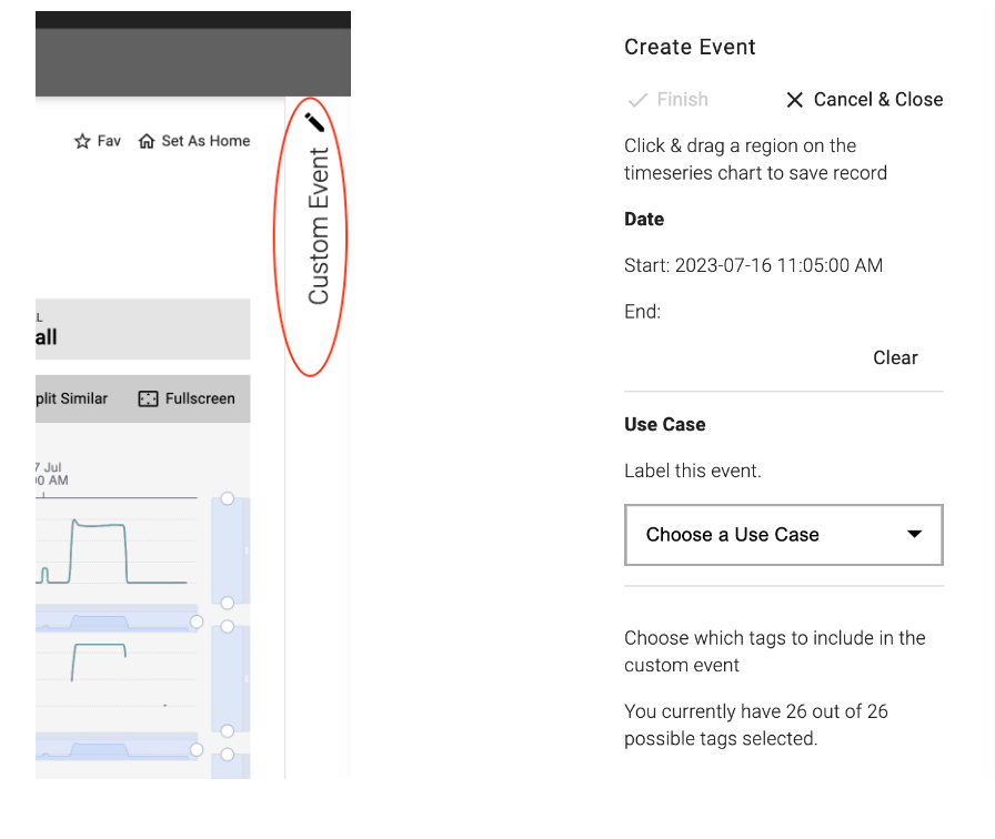 With the ‘Create Event’ dialog box open, the user can click and drag to highlight a region on the time series. The start/end shown in the dialog box will update based on the highlighted region selected.