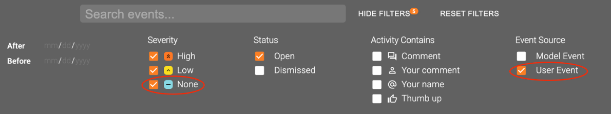 To view all user created events from the Events page note that these events are created with severity None. It is necessary to adjust the filters to include severity None, which is excluded by default, and also to select Event Source as User Event.