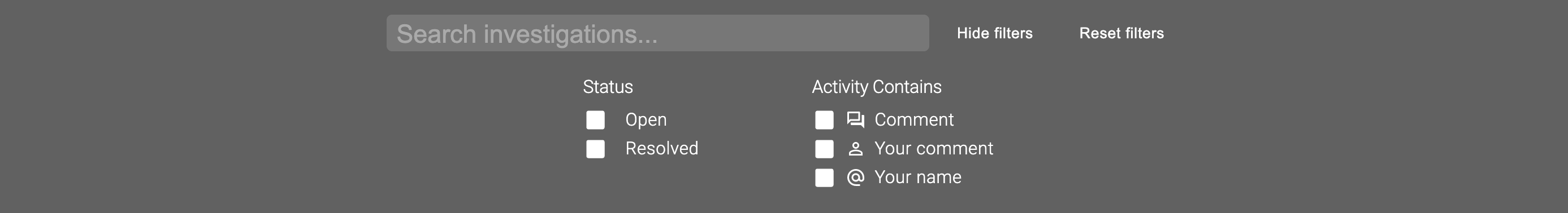 By default, you can see both open and resolved investigations. If you are looking for a specific investigation, you can filter the list by inputting text in the search box, or use the drop down filters by clicking the "Show filters" button.