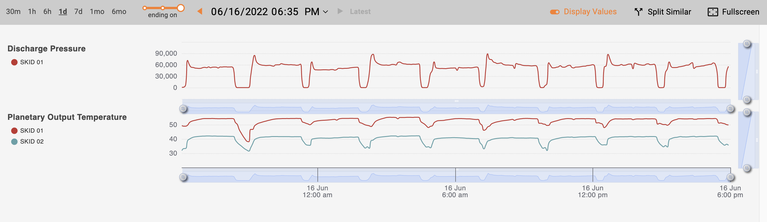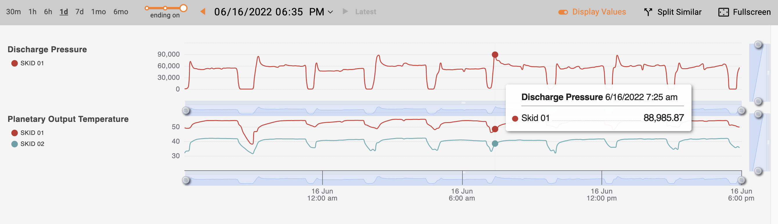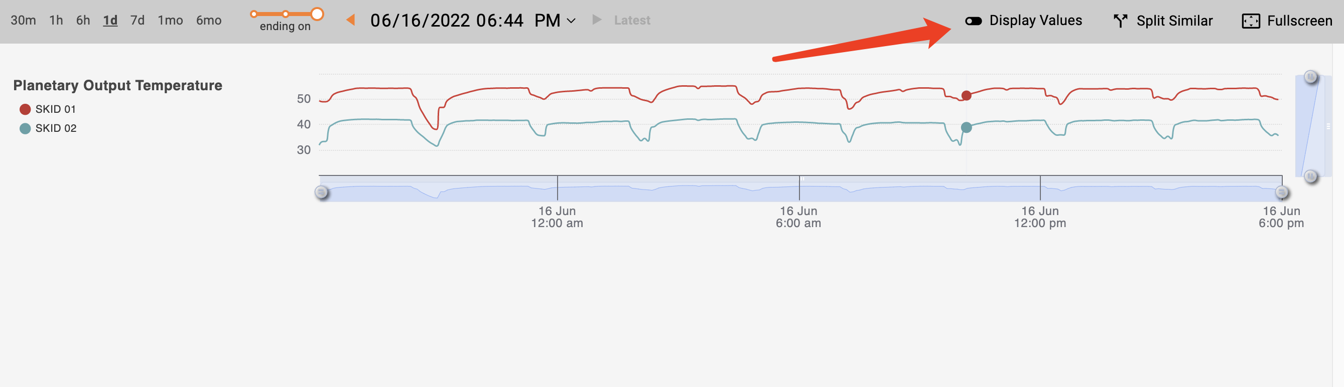 When you hover your cursor over the charts, a tooltip pops up displaying values for the lines or points on the current chart. You can turn off the tooltip using the "Display Values" toggle (enabled by default).