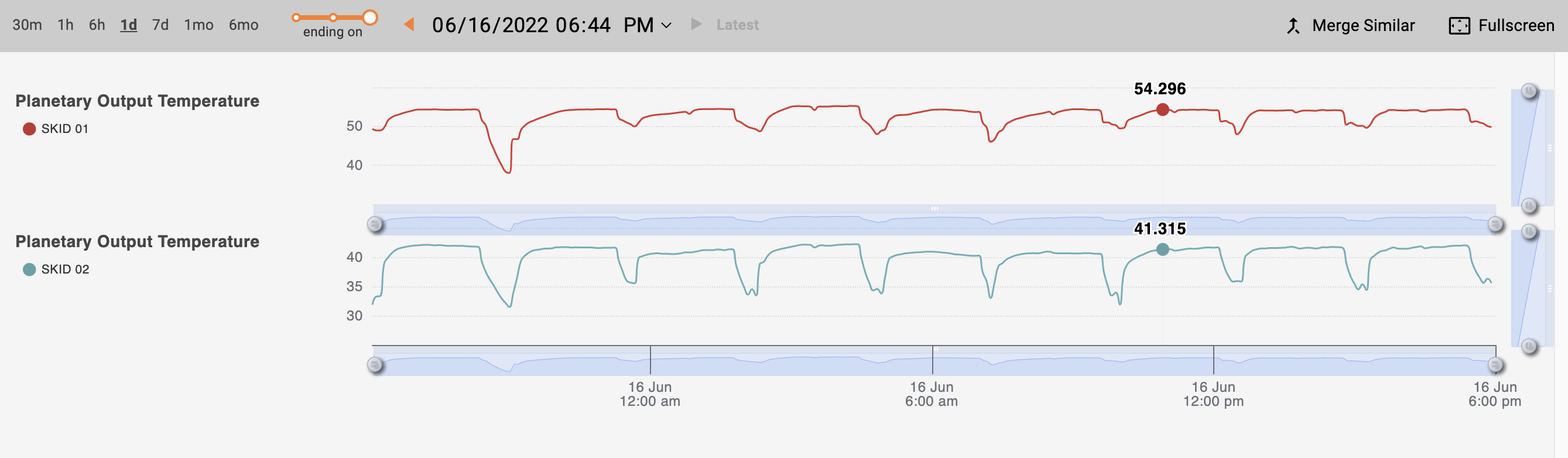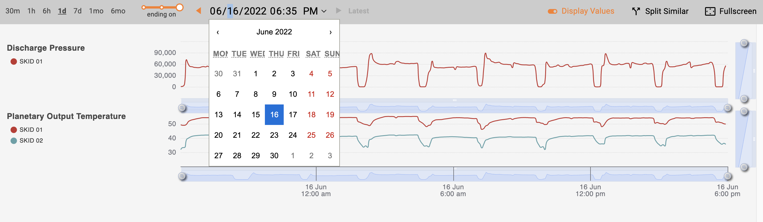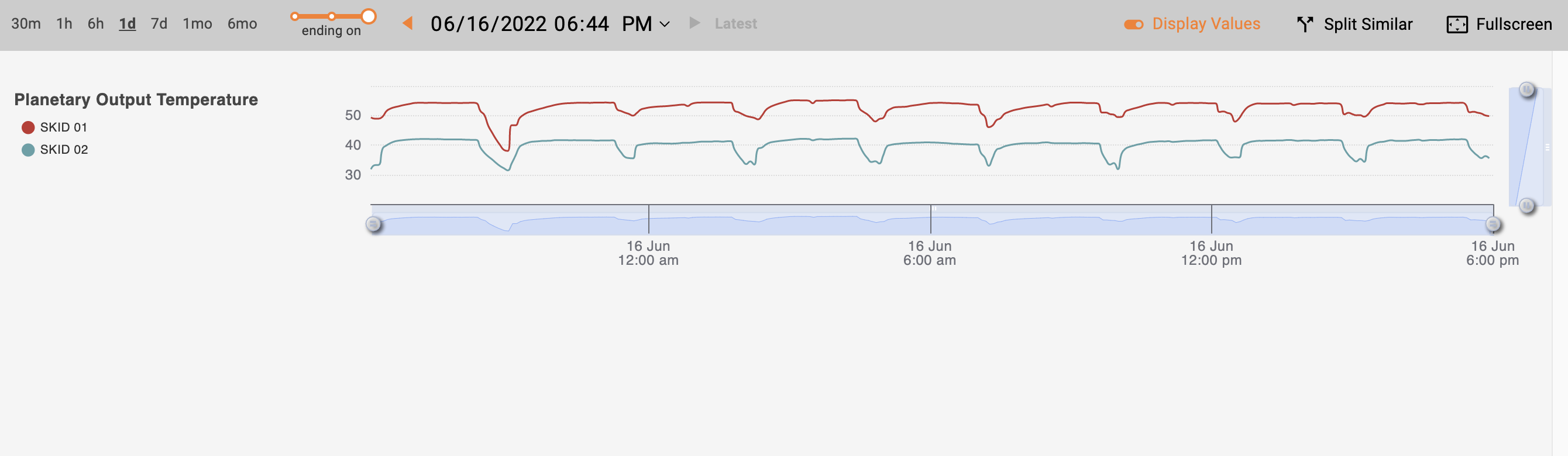 When you hover your cursor over the charts, a tooltip pops up displaying values for the lines or points on the current chart. You can turn off the tooltip using the "Display Values" toggle (enabled by default).
