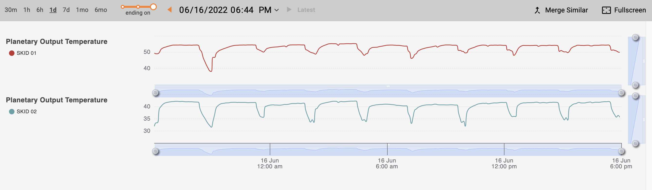 The slider under each chart offers ability to zoom in. Drag the handles on the left / right most of the slider to adjust the scale, and drag the handle to move across time.